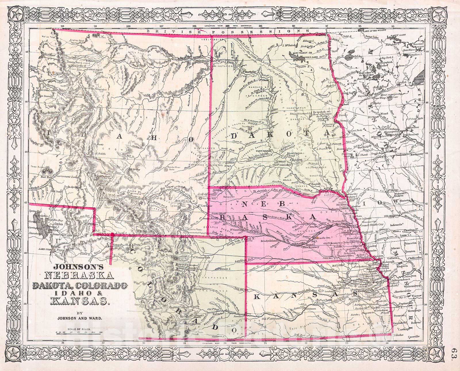 1863 Johnson’s Map of Colorado, Dakota, Idaho, Nebraska ^ Kansas